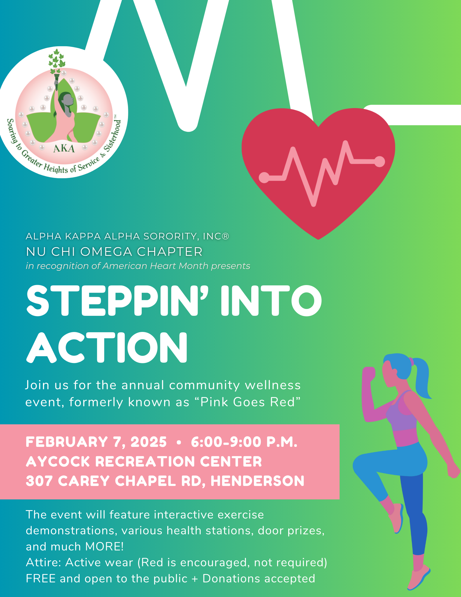 In recognition of American Heart Health Month, please join the ladies of Nu Chi Omega for interactive sessions that promotes heart health. The event will take place at Aycock Recreation Center on Friday, February 7th from 6:00-9:00PM.