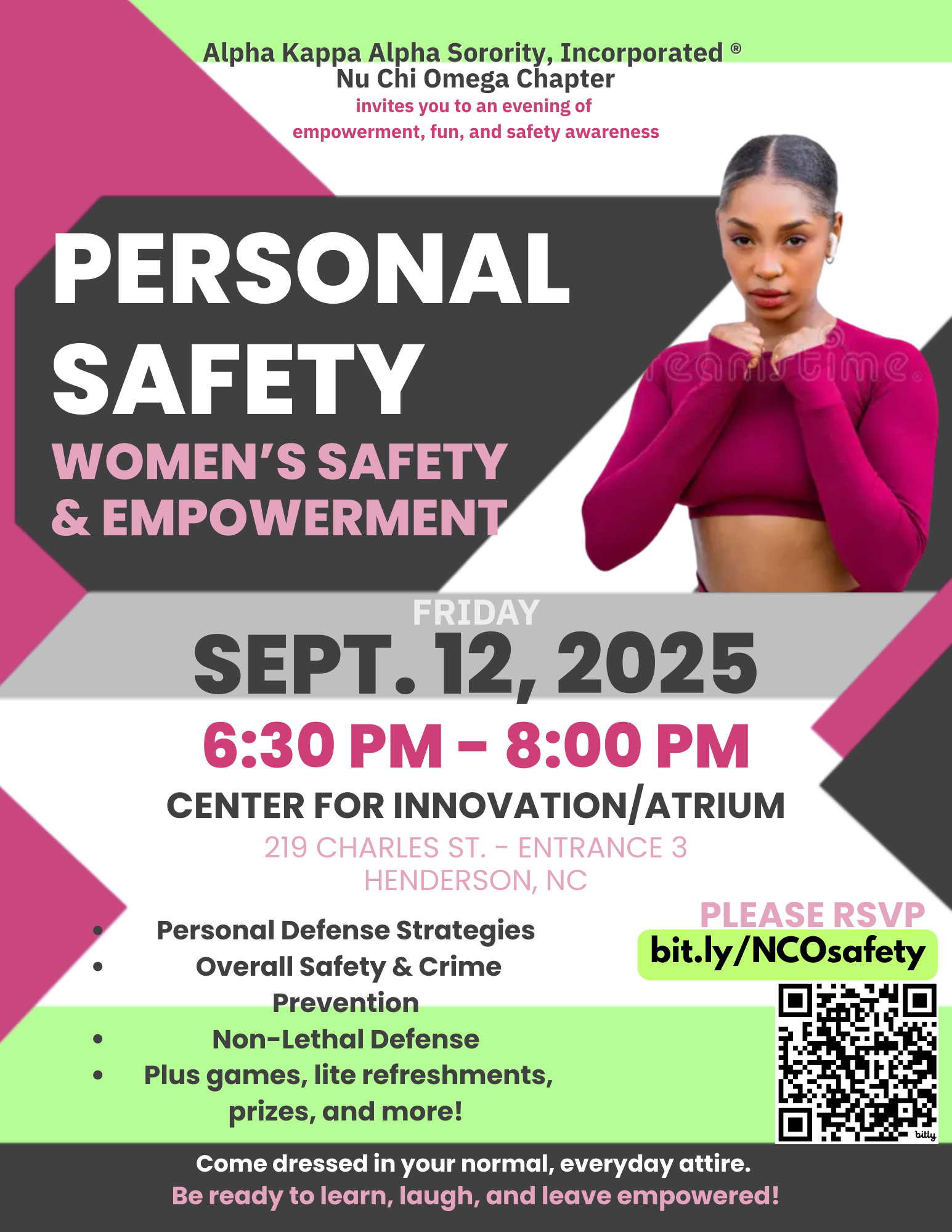 The GenerationNEXT & Build Our Economic Wealth committees invites you to an evening of empowerment & safety awareness! The Personal Safety for Women event is scheduled for Friday, September 12, 2025, from 6:30–8:00 PM at the Center for Innovation Atrium | 219 Charles St., Entrance 3, Henderson, NC. Chapter members are welcome to invite a female… Read More »Personal Safety & Women’s Empowerment Workshop
